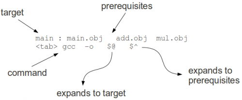 În exemplul de mai sus au fost definite variabilele CC și CFLAGS. Variabila CC reprezintă compilatorul folosit, iar variabila CFLAGS reprezintă opțiunile (flag-urile) de compilare utilizate; în cazul de față sunt afișarea avertismentelor și compilarea cu suport de depanare. Referirea unei variabile se realizează prin intermediul construcției $(VAR_NAME). Astfel, $(CC) se înlocuiește cu gcc, iar $(CFLAGS) se înlocuiește cu -Wall -g.