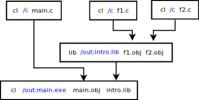 Pentru obținerea unei biblioteci statice folosim comanda lib. Argumentul /out: precizează numele bibliotecii statice de ieșire. Biblioteca are de obicei extensia *.lib. Pentru obținerea executabilului se folosește cl care primește ca argumente fișierele obiect și bibliotecile care conțin funcțiile dorite.